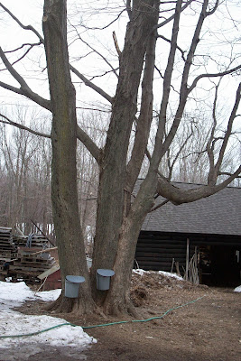 The collecting buckets, or taps as they call them. That’s the sugarhouse in the background.